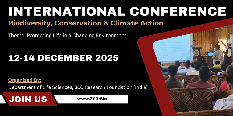 Organised by the Department of Life Sciences, 360 Research Foundation (India), the International Conference on Biodiversity, Conservation & Climate Action will be held from 12-14 December 2025. With the theme “Protecting Life in a Changing Environment”, the conference will address critical issues of biodiversity loss, habitat conservation, and climate resilience. Researchers, conservationists, and policymakers will present findings, share best practices, and explore strategies for safeguarding ecosystems. The event seeks to strengthen scientific and community-driven efforts to preserve biodiversity, mitigate climate change impacts, and promote sustainable environmental stewardship for future generations. CLICK HERE TO REGISTER